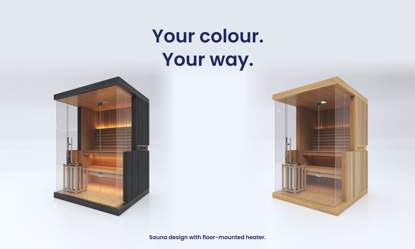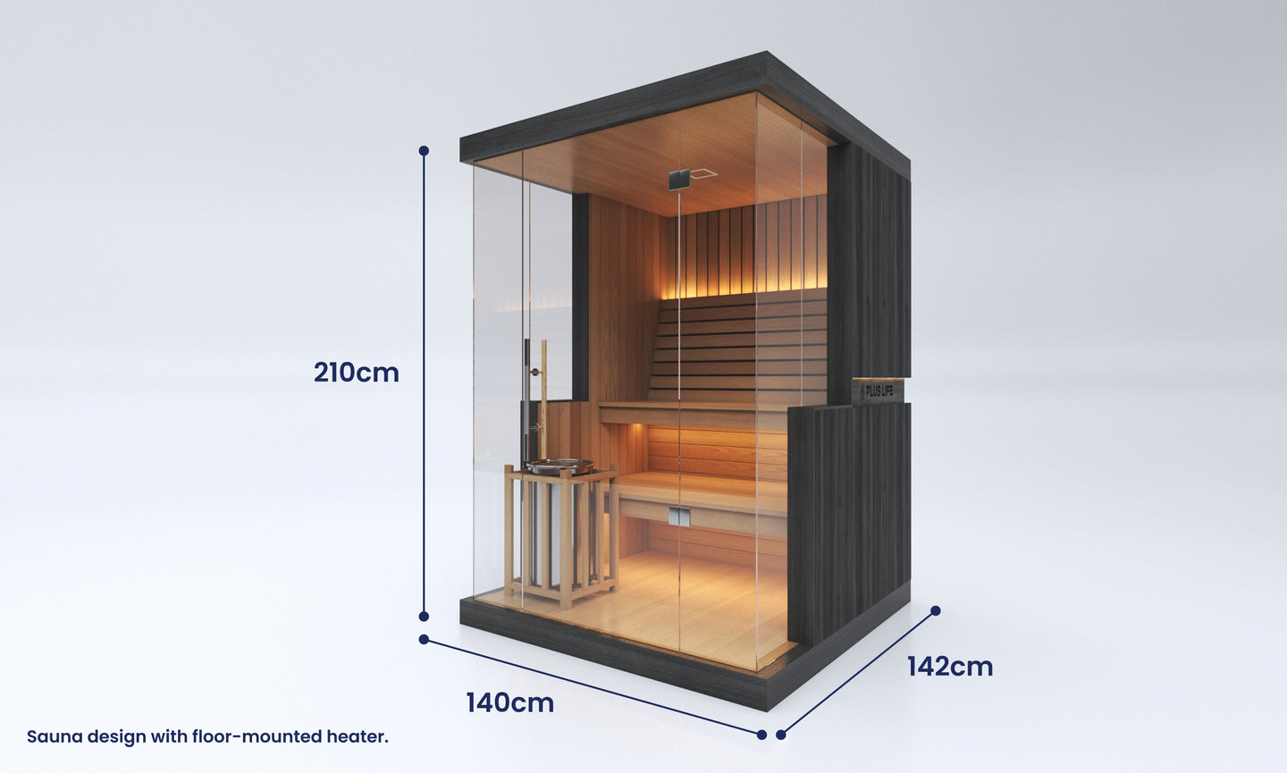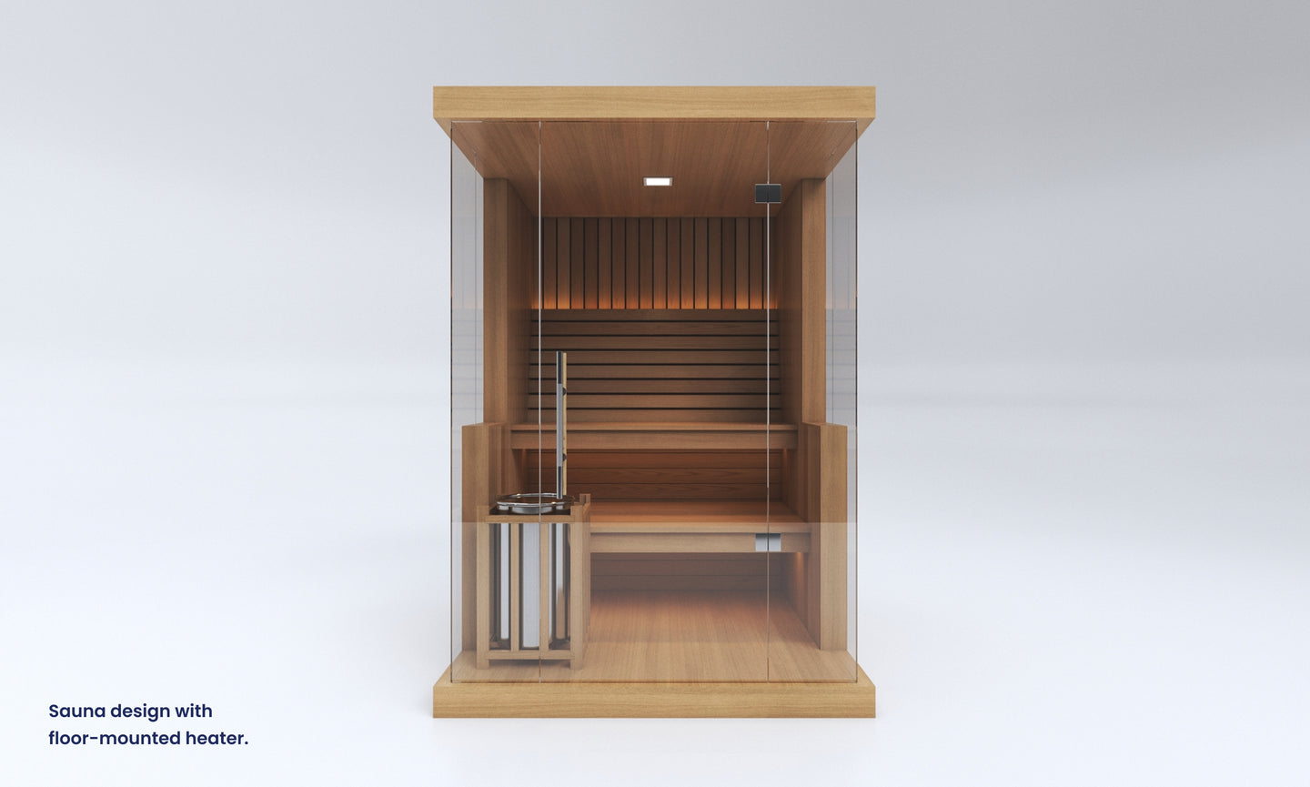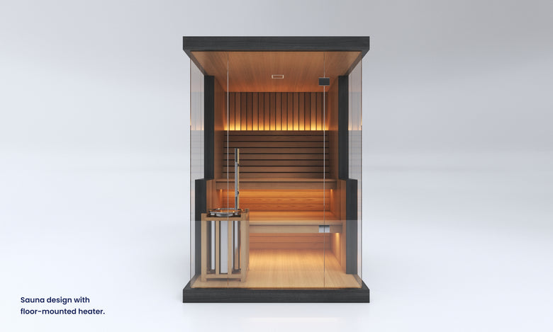 The final wall design of this sauna may vary slightly depending on your choice of heater. Wall-mounted heaters require a version with reduced glass, as they must be mounted directly onto timber. Floor-mounted heaters allow for more glass, preserving a more open design. Our base design includes a wall-mounted heater, so any changes will be made from this default. A different price may apply for floor-mounted heater options. Unsure which heater suits your needs best? Chat with our sales team — we’re here to help you choose the ideal setup.