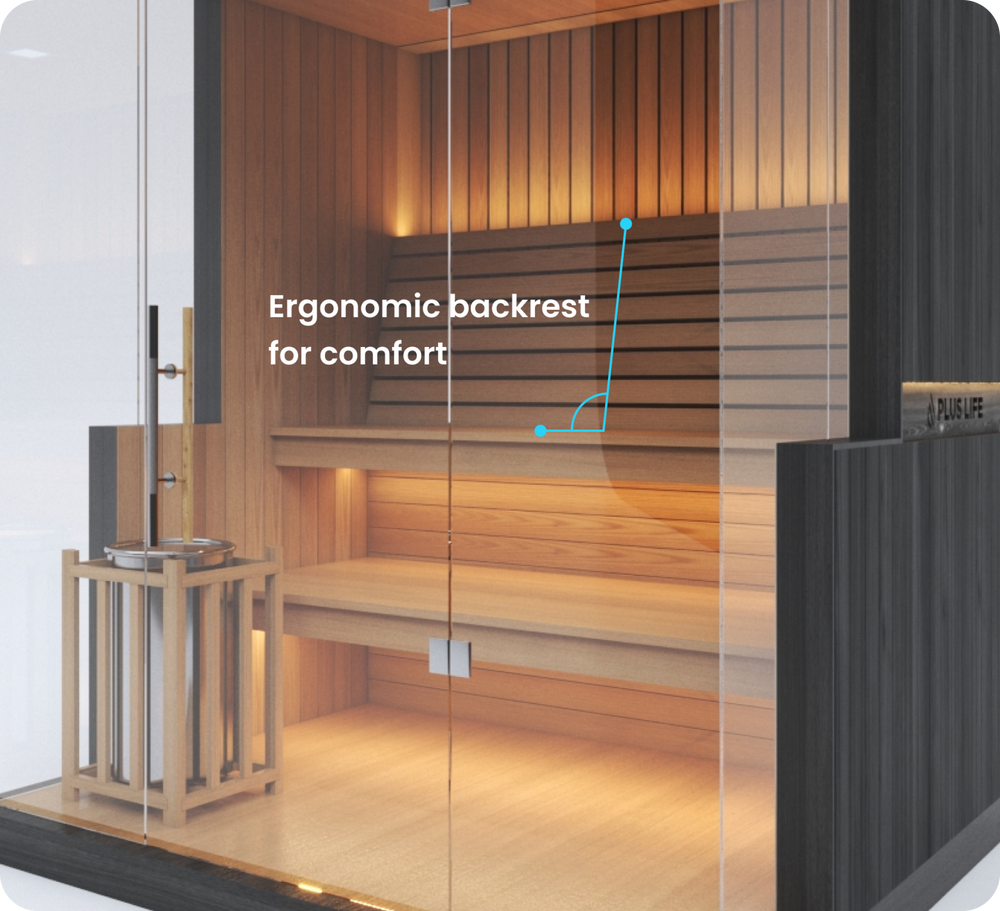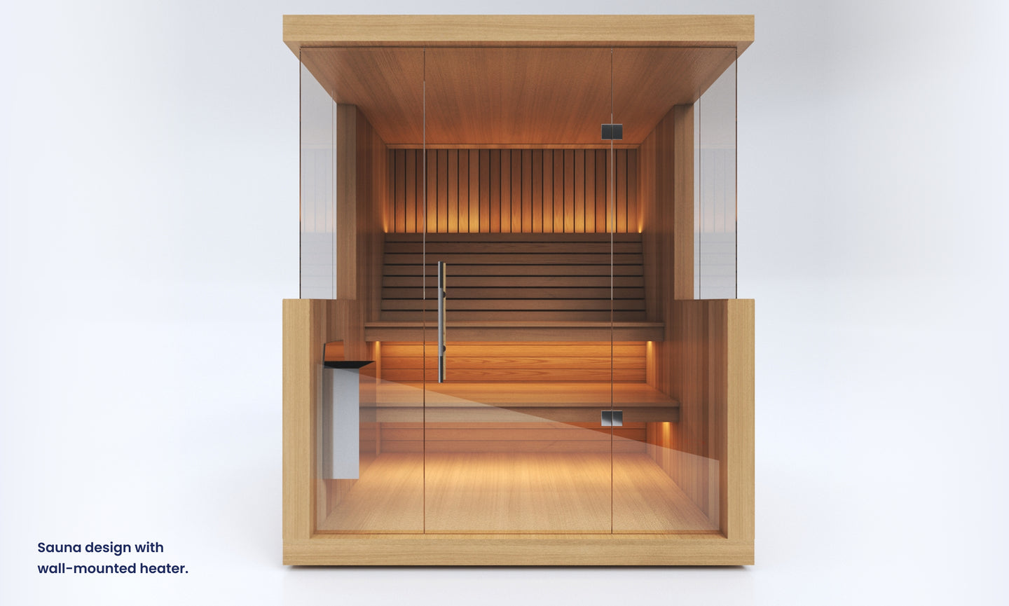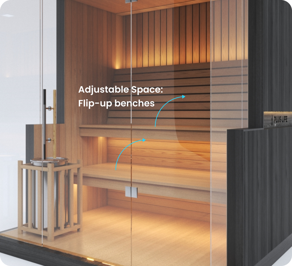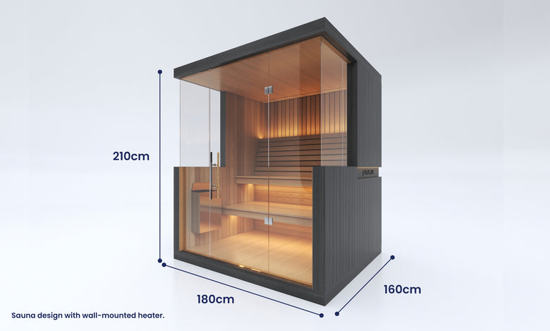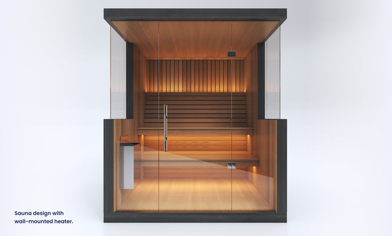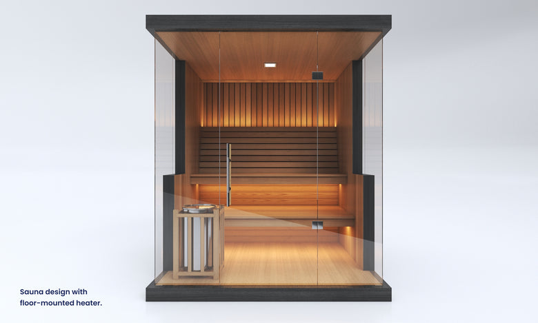 The final wall design of this sauna may vary slightly depending on your choice of heater. Wall-mounted heaters require a version with reduced glass, as they must be mounted directly onto timber. Floor-mounted heaters allow for more glass, preserving a more open design. Our base design includes a wall-mounted heater, so any changes will be made from this default. A different price may apply for floor-mounted heater options. Additionally, this sauna includes easy flip-up benches designed to transform the space into a versatile area for hot yoga or workouts. This feature is only available for residential use — saunas delivered to commercial spaces will not include flip-up benches. Unsure which heater suits your needs best? Chat with our sales team — we’re here to help you choose the ideal setup.