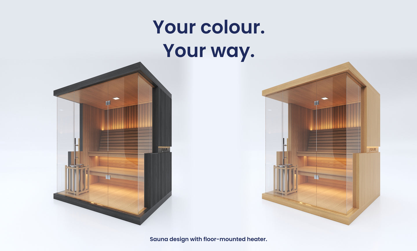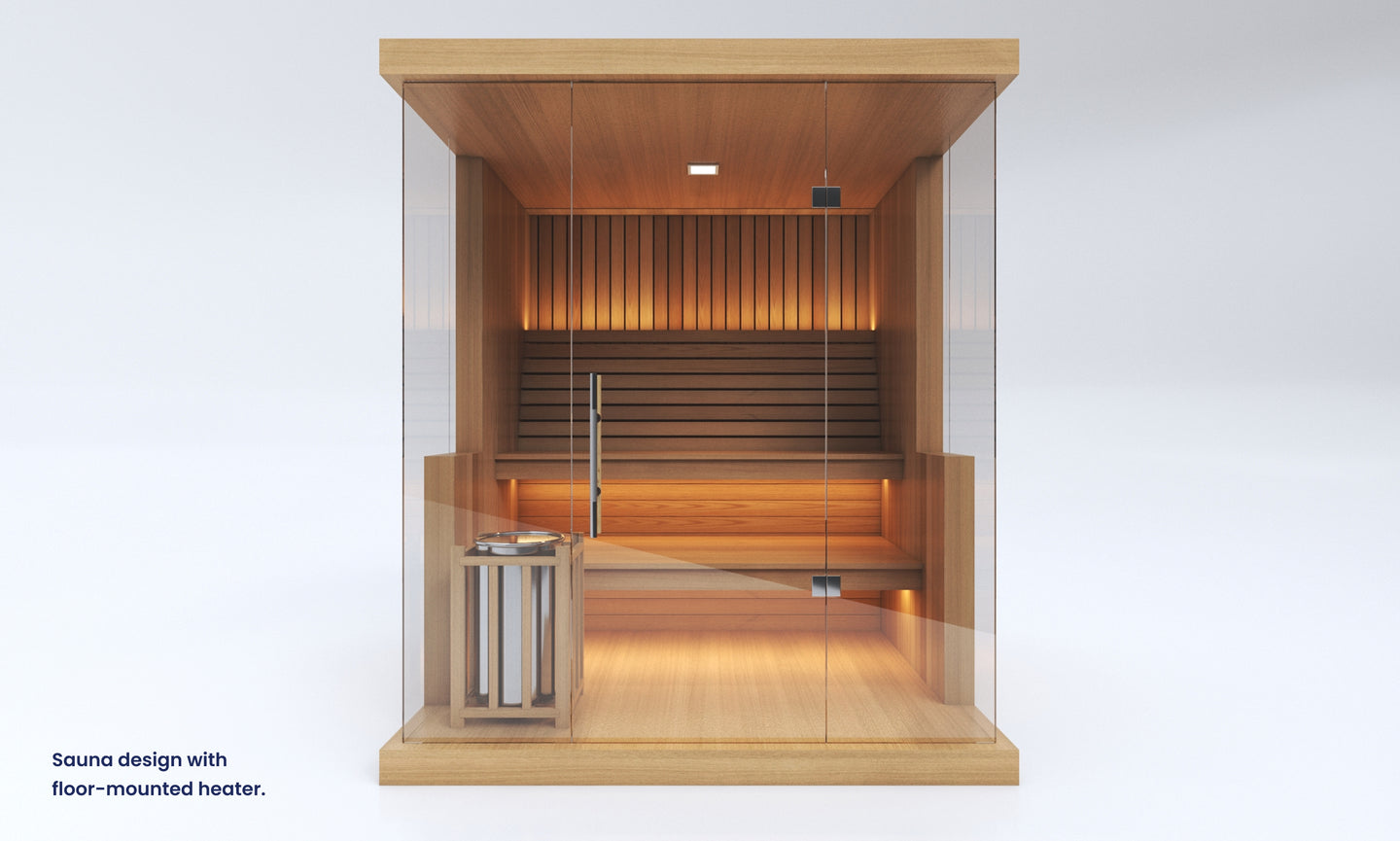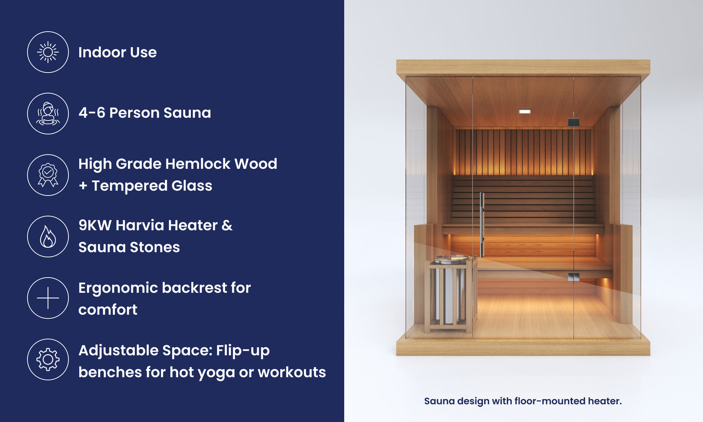 The final wall design of this sauna may vary slightly depending on your choice of heater. Wall-mounted heaters require a version with reduced glass, as they must be mounted directly onto timber. Floor-mounted heaters allow for more glass, preserving a more open design. Our base design includes a wall-mounted heater, so any changes will be made from this default. A different price may apply for floor-mounted heater options. Additionally, this sauna includes easy flip-up benches designed to transform the space into a versatile area for hot yoga or workouts. This feature is only available for residential use — saunas delivered to commercial spaces will not include flip-up benches. Unsure which heater suits your needs best? Chat with our sales team — we’re here to help you choose the ideal setup.