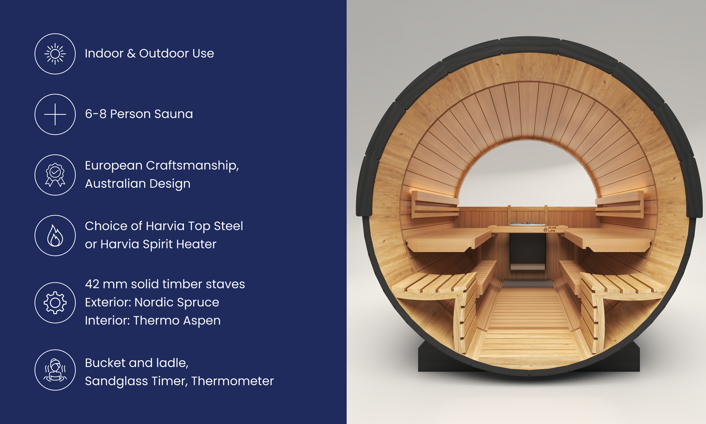 Built with 42 mm solid timber staves, the Sauna features some of the thickest sauna walls in Australia. This enhanced wall thickness provides outstanding insulation, superior structural rigidity, and effective sound reduction, ensuring a stable, quiet, and energy-efficient sauna environment.