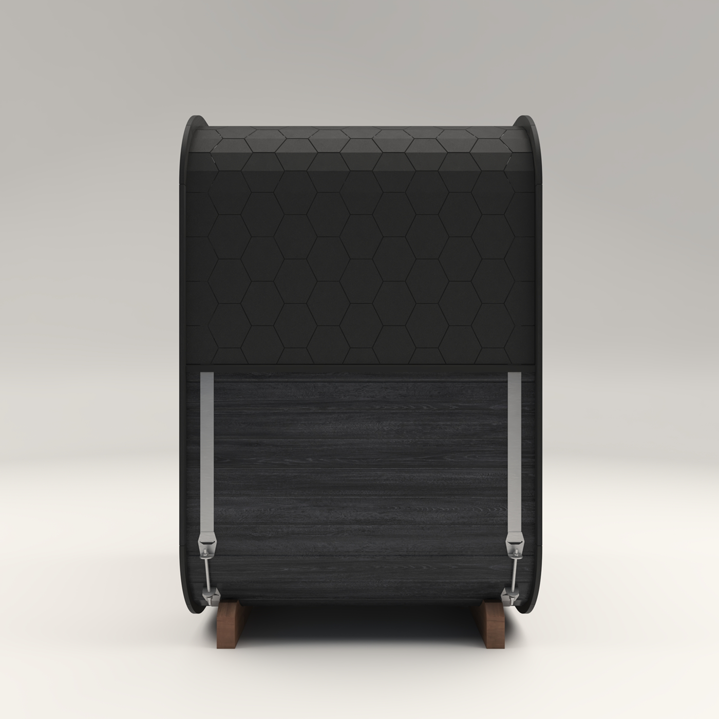 The exterior matte black Thermo Pine delivers lasting weather resistance and architectural appeal, while elevated Thermo Aspen benches enhance airflow and comfort. Both timbers are thermally modified through a chemical-free heat and steam process, ensuring eco-friendly strength, stability, and moisture resistance.